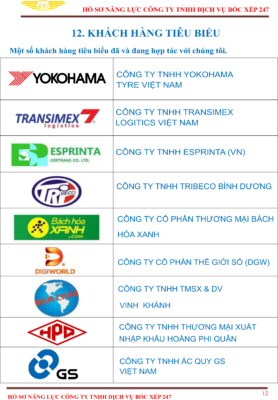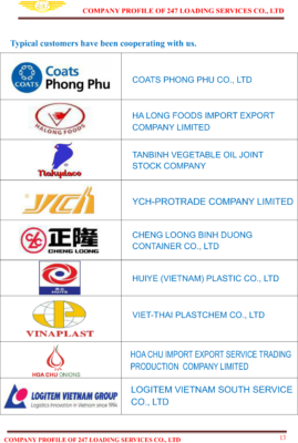• Đã có sự hợp tác và đồng hành cùng các công ty, tập đoàn lớn như: Công Ty Cổ Phần Logistics Transimex, Công Ty Cổ Phần Quốc Tế Phong Phú, Công Ty Cổ Phần Thế Giới Di Động, Công Ty Nước Giải Khát Cocacola, Công Ty Cổ Phần DGW, Công Ty Yokohama Việt Nam, Công Ty Tnhh Dịch Vụ Logitem Việt Nam, Công Ty Tnhh Sản Xuất Giấy – Bao Bì Bình Dương Chinh Long…vvv…